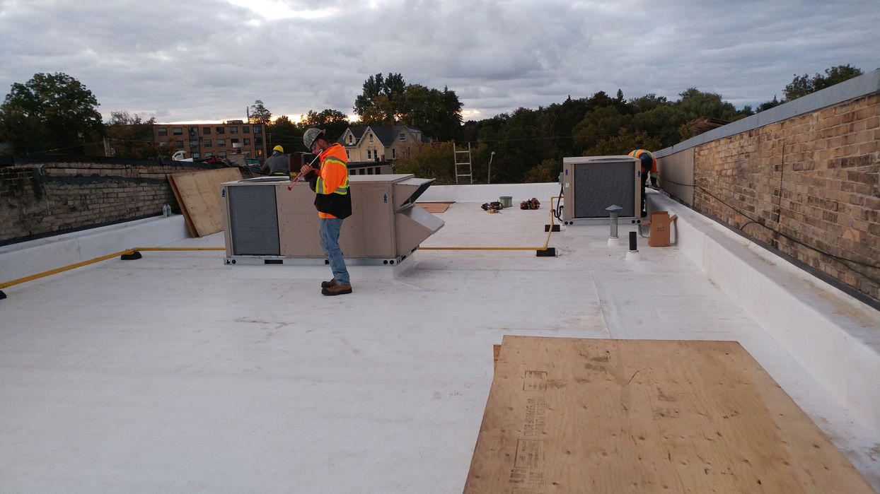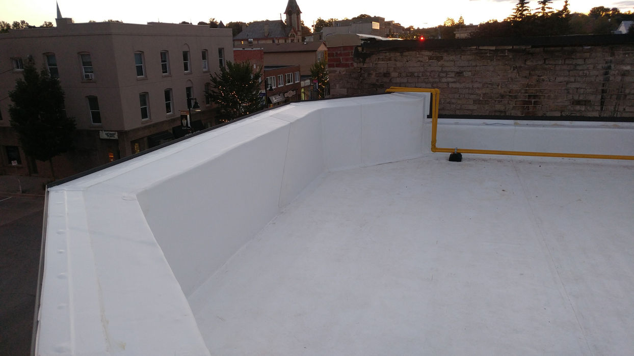 This project involved a complete retrofit of a commercial storefront roof system and front wall. The scope included installation of a new white flat roofing membrane for improved reflectivity and energy performance, comprehensive waterproofing to safeguard the building envelope, and restoration of the top front wall to reinforce structure and preserve the building's appearance. The work was completed in a high-visibility downtown area with careful attention to site cleanliness and minimal disruption to tenants and foot traffic.